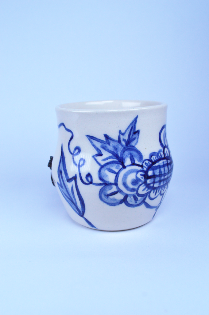 This is a small wheel thrown mug. It is made from white porcelain and is microwave and top rack of the dish washer safe. It is decorated with a sculptural Monarch butterfly and hand painted blue and white designs.