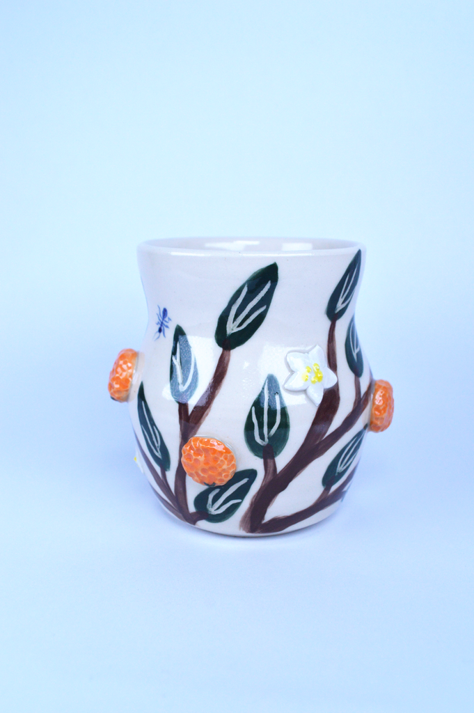 This is a small, wheel thrown mug. It is made from white porcelain and it is microwave and top rack of the dish washer safe. It is decorated with ants and sculptural oranges.