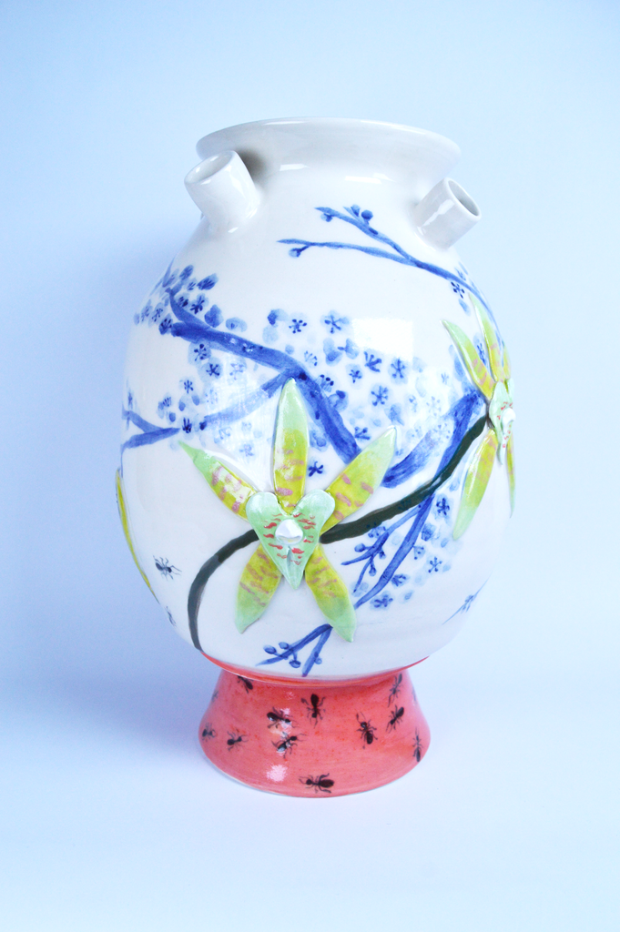 This is a large vase adorned with sculptural orchid flowers and hand painted cherry blossoms. Inspired by the traditional form of Tulipiere, the extra spouts are designed to make your flower arrangements look more dramatic! Perfect for a medium to large size bouquet.