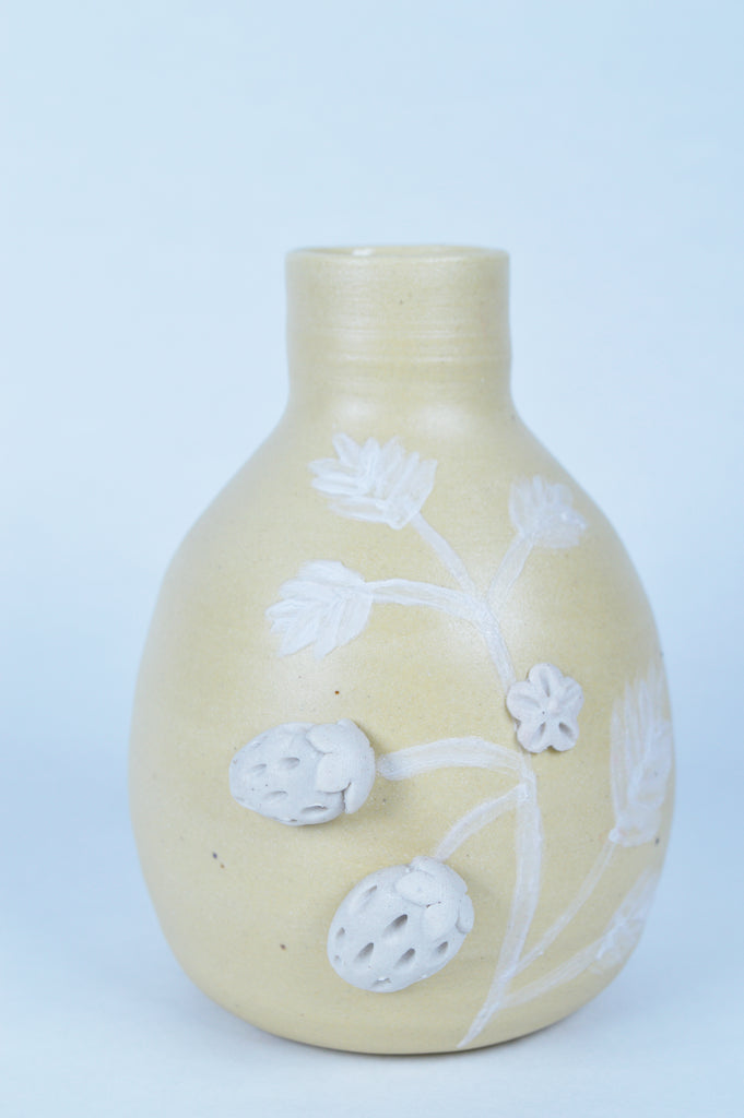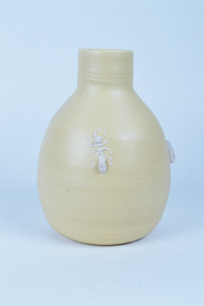 This is a small, butter yellow, bud vase that is inspired by Jasperware. Made from porcelain It is decorated with sculpted strawberries and an ant.