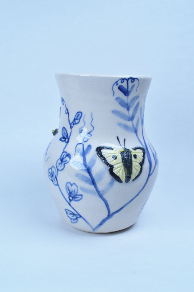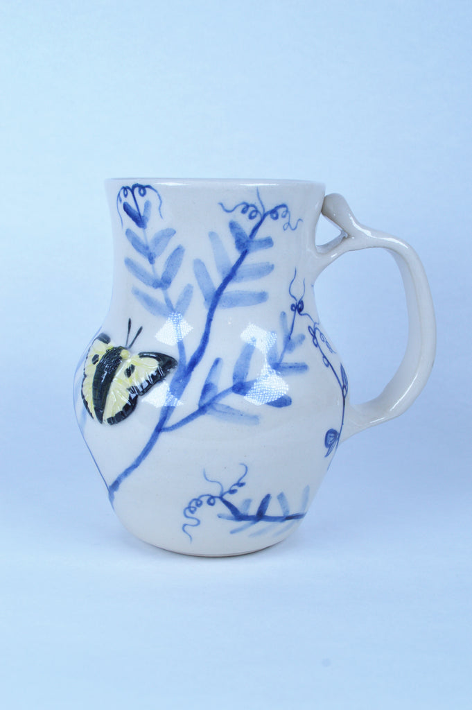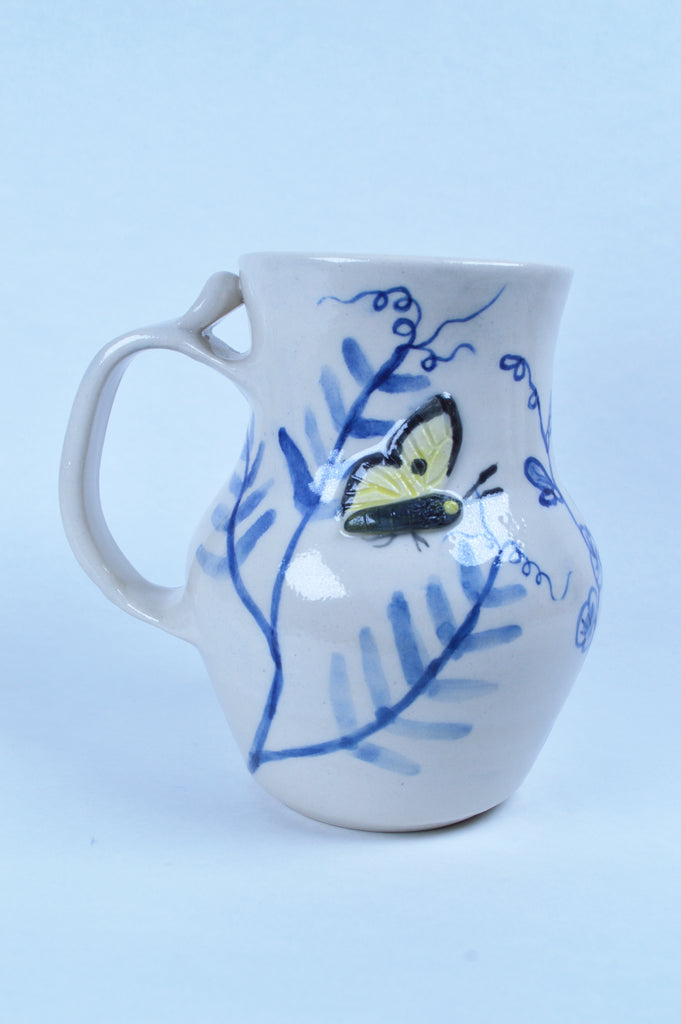 This is a medium wheel thrown mug. It is made from white porcelain and is microwave and top rack of the dish washer safe. It is decorated with sculptural Cabbage White butterflies and illustrated Vetch.
