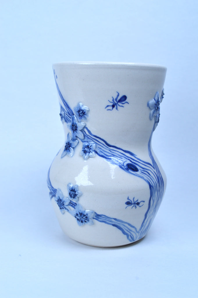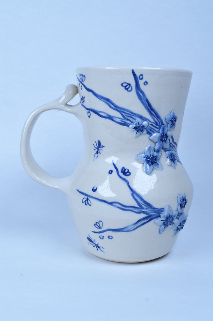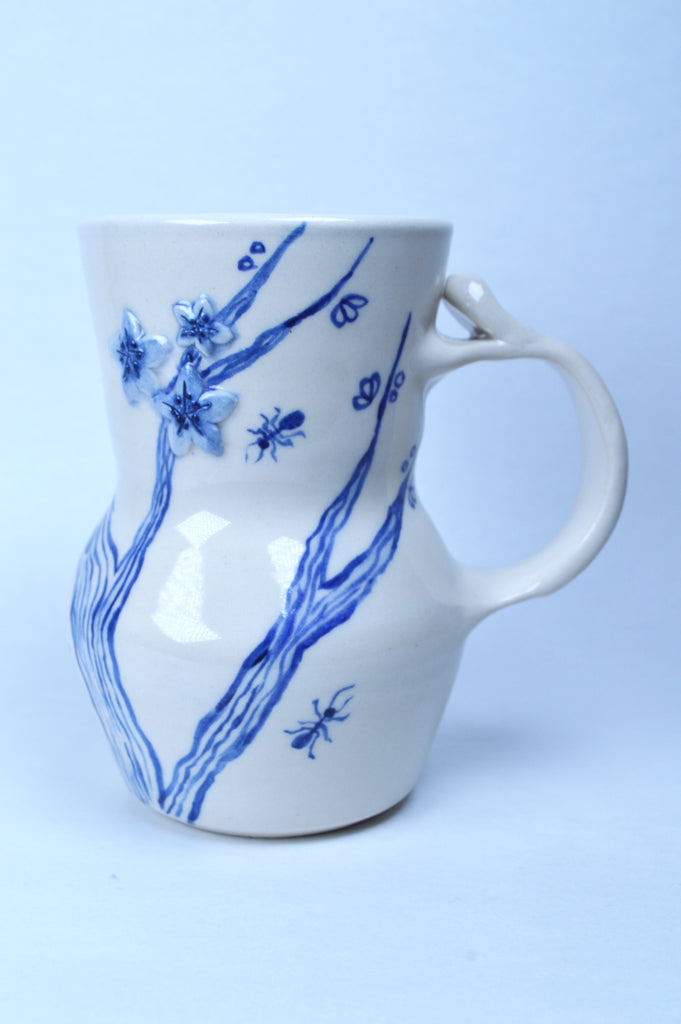 This is a medium wheel thrown mug. It is made from white porcelain and is microwave and top rack of the dish washer safe. It is decorated with sculptural Cherry blossoms and illustrated ants.